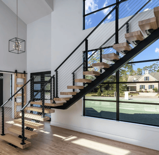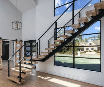 Floating staircases create a sense of openness with their clean, suspended design. The structure is often crafted from mild steel for strength, while treads can be made from glass, wood, or steel. Stainless steel accents, like handrails or balustrades, enhance the sleek, modern look.